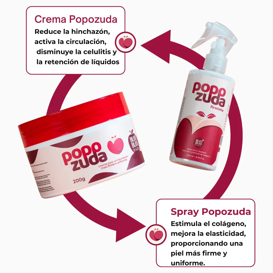 Crema y spray Popozuda™ actúan juntos para reducir celulitis, aclarar estrías y dejar tu piel más firme y uniforme